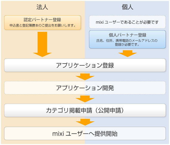 個人の方は、ご利用のmixiアカウントを個人パートナー登録していただくとアプリを作成できるようになります。